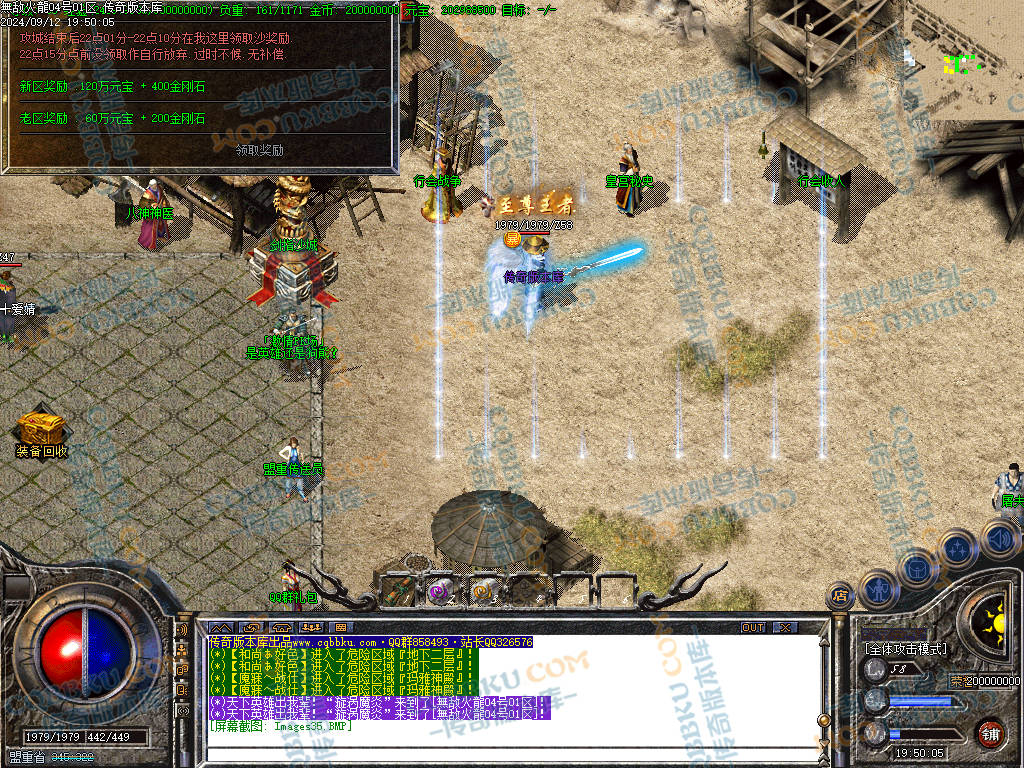 版本介绍:新区第2天下午合区,第2天晚上晚8点攻沙,首次沙奖励800W元宝,以后每天500W元宝。